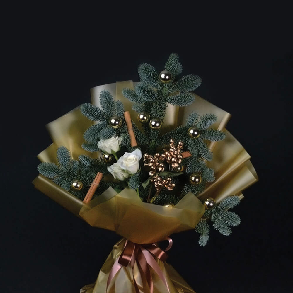 Hand-tied bouquet with a mixture of fresh nobilis, 3 white roses, gold painted hypericum, gold Christmas baubles and cinnamon gently crafted in a gold wrapping.